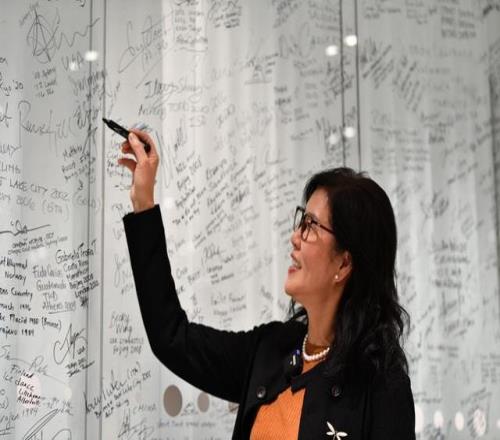 11月24日,郎平颁奖仪式后在签名墙上签名。新华社记者 连漪 摄