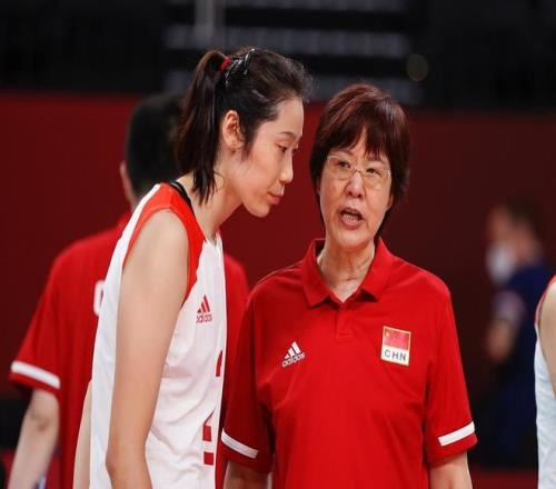 2021年7月29日,中国队主教练郎平(右)与朱婷交流。当日,在东京奥运会女排小组赛中,中国队以2比3不敌俄罗斯运动员。 中新社记者 韩海丹 摄。视觉中国 图