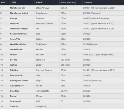 尽管2023年切尔西在新赛季开始一个月后成功与美国新锐科技公司Infinite Athlete达成超4000万英镑的合作,但也仅仅合作一个赛季便草草结束。切尔西在2024-25赛季的大部分时间都陷入“裸奔”窘境,直至赛季末迪拜房地产开发商Damac签下短期赞助协议,以700万买下赛季剩余7场比赛的胸前广告位。而在训练场上,切尔西球员胸前也有加密货币公司BingX以1100万英镑价格入局,这一价位在英超已然与富勒姆等中下游球队的胸前广告价位对等。