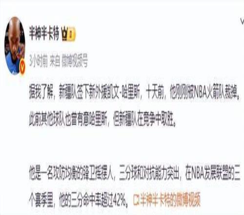 新疆男篮本赛季外援阵容挑选出现失误,先后两名外援离队,华莱士擅自离队,路易斯-金则是打完俱乐部杯赛后被裁,华莱士则是擅自离队,在这种情况下,新疆男篮只能紧急签下第四外援,引进了后卫理查德森。从新疆男篮目前现有的三名外援来看,大外援劳森依旧是第一核心,纳托尔定位是第三或者第四外援,个人状态起伏太大,新援理查德森能否补强后场还是未知数,在这种情况下,新疆男篮最终还是选择继续补强阵容。据媒体人“半神半卡特”报道:“据我了解,新疆队签下新外援凯文-哈里斯,十天前,他刚刚被NBA火箭队裁掉。此前其他球队也曾有意哈里斯,但新疆队在竞争中取胜。”新疆男篮目前急缺一名进攻能力极强的小外援,刘炜指导还是非常期待新援哈里斯能够挑起球队大梁,成为球队的救火奇兵。
