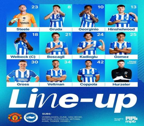 布莱顿首发:23-斯蒂尔、42-科波拉、24-卡迪奥卢、21-博斯卡利、34-费尔特曼、13-欣谢尔伍德、25-戈麦斯、30-格罗斯、8-格鲁达、10-吕特、18-维尔贝克
