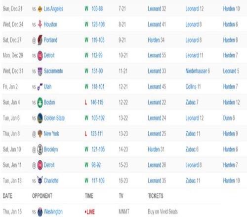 北京时间1月15日,快船以119-105击败奇才拿到四连胜。这场比赛科怀-莱昂纳德在手感没有那么出色的情况下依旧砍下30+(连续两场30+),因为他的外线比中投还准,本赛季小卡增加外线的出手后效果非常之好,此役命中7个三分球追平生涯最高。