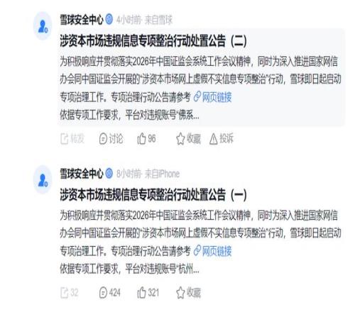 监管处罚发出后,雪球平台开展了整治资本市场违规信息的专项行动。1月20日,雪球先后发布两份《涉资本市场违规信息专项整治行动处置公告》,对相关违规账号进行封禁。